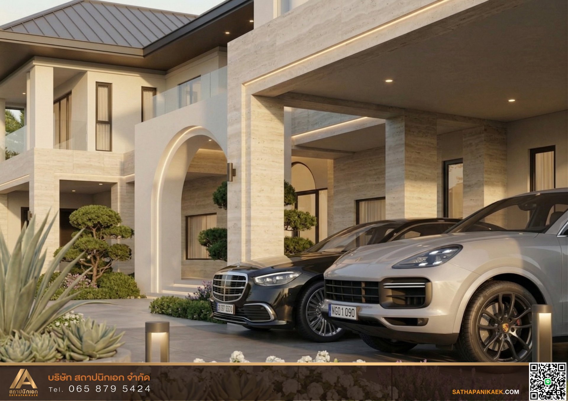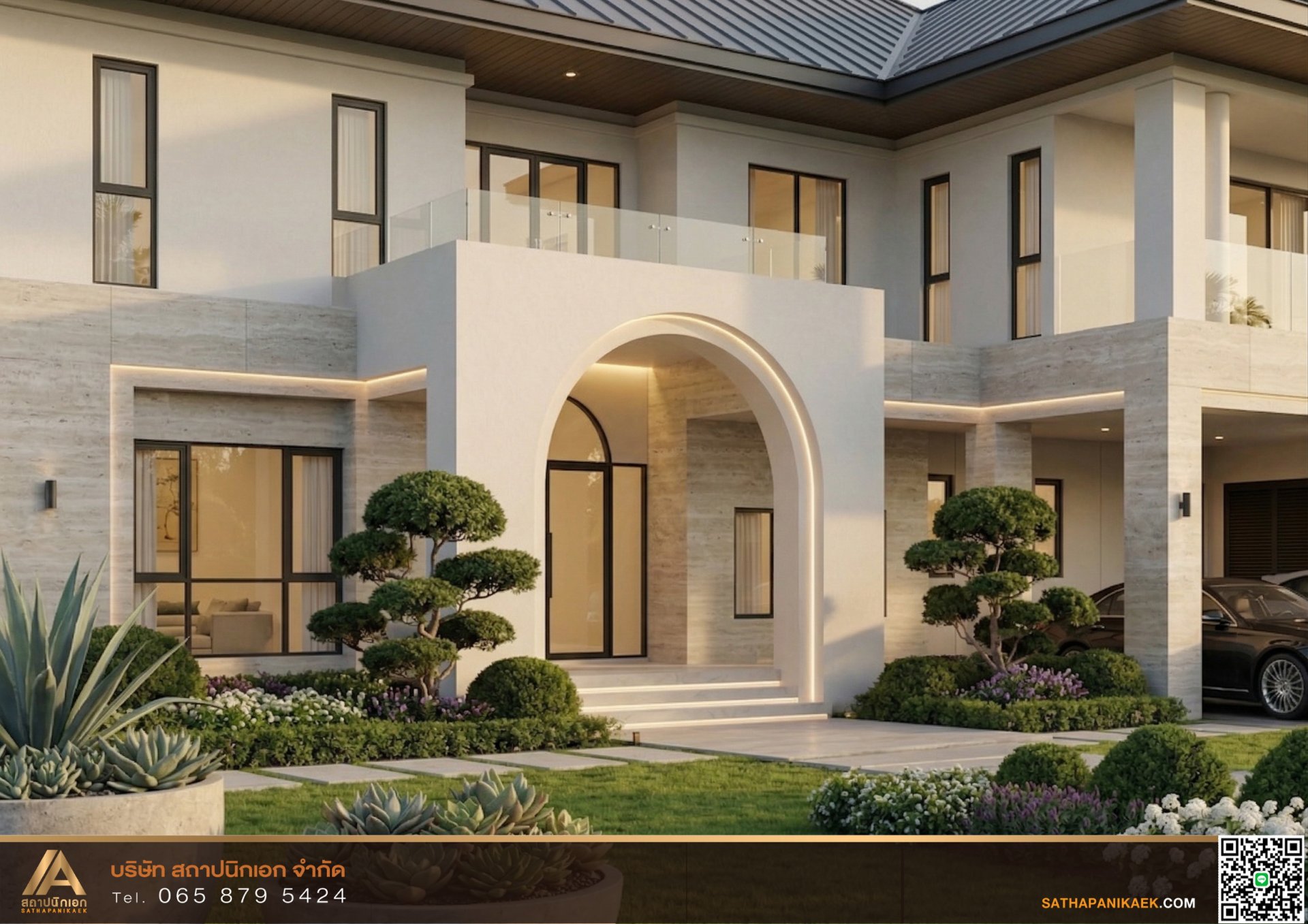 แบบบ้านหรู 2 ชั้นสไตล์ Modern Luxury "ประสบการณ์การอยู่อาศัยที่เหนือระดับกับแบบบ้าน 2 ชั้นในโมเดิร์น-ลักชูรี ที่มุมประตูโค้ง (Arched Entrance) ขนาดใหญ่ทำให้ดูโอ่อ่ากับกันตกกระจกและหน้าต่างบานใหญ่ที่เพิ่มความโล่งและดูทันสมัยพบกับบริษัทสถาปนิกเอกสร้างหรูที่สะท้อนรสนิยมอันโดดเด่นให้เราเป็นผู้นำเนรมิตบ้านในอุดมคติของคุณ