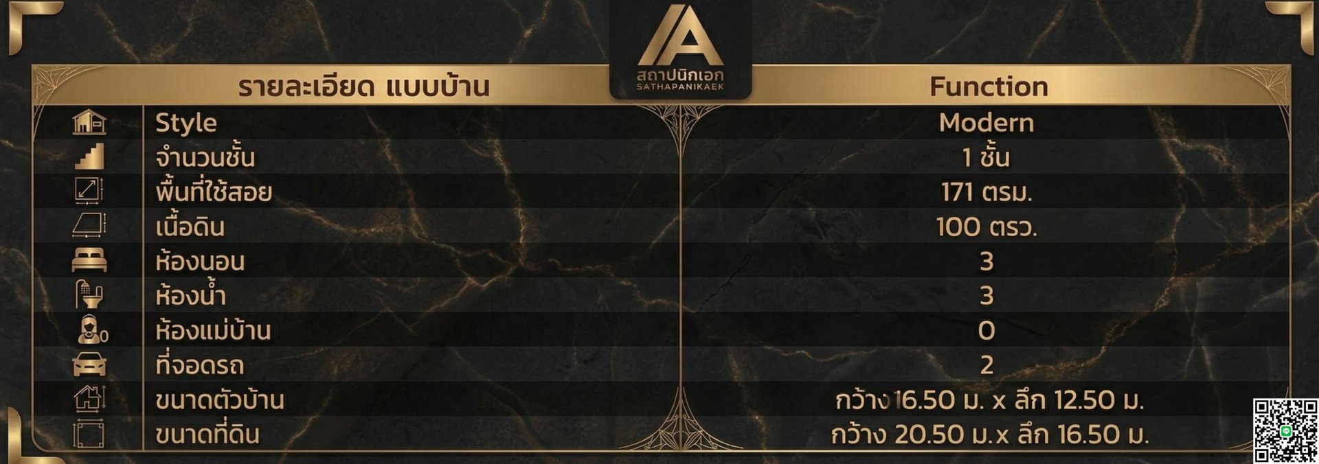 แบบบ้านชั้นเดียว A-171 พื้นที่ใช่สอย 230 ตรว. สไตล์ทรอปิคอลโมเดิร์น ฟังก์ชันครบครั่น 3 ห้องนอน 3 ห้องน้ำ รับแขก ทานอาหาร ครัว จอดรถ 2 คัน