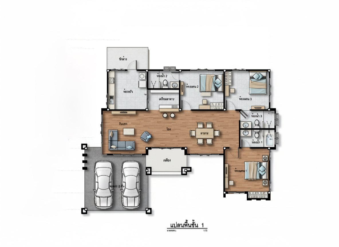 แบบบ้านชั้นเดียว A-171 พื้นที่ใช่สอย 230 ตรว. สไตล์ทรอปิคอลโมเดิร์น ฟังก์ชันครบครั่น 3 ห้องนอน 3 ห้องน้ำ รับแขก ทานอาหาร ครัว จอดรถ 2 คัน