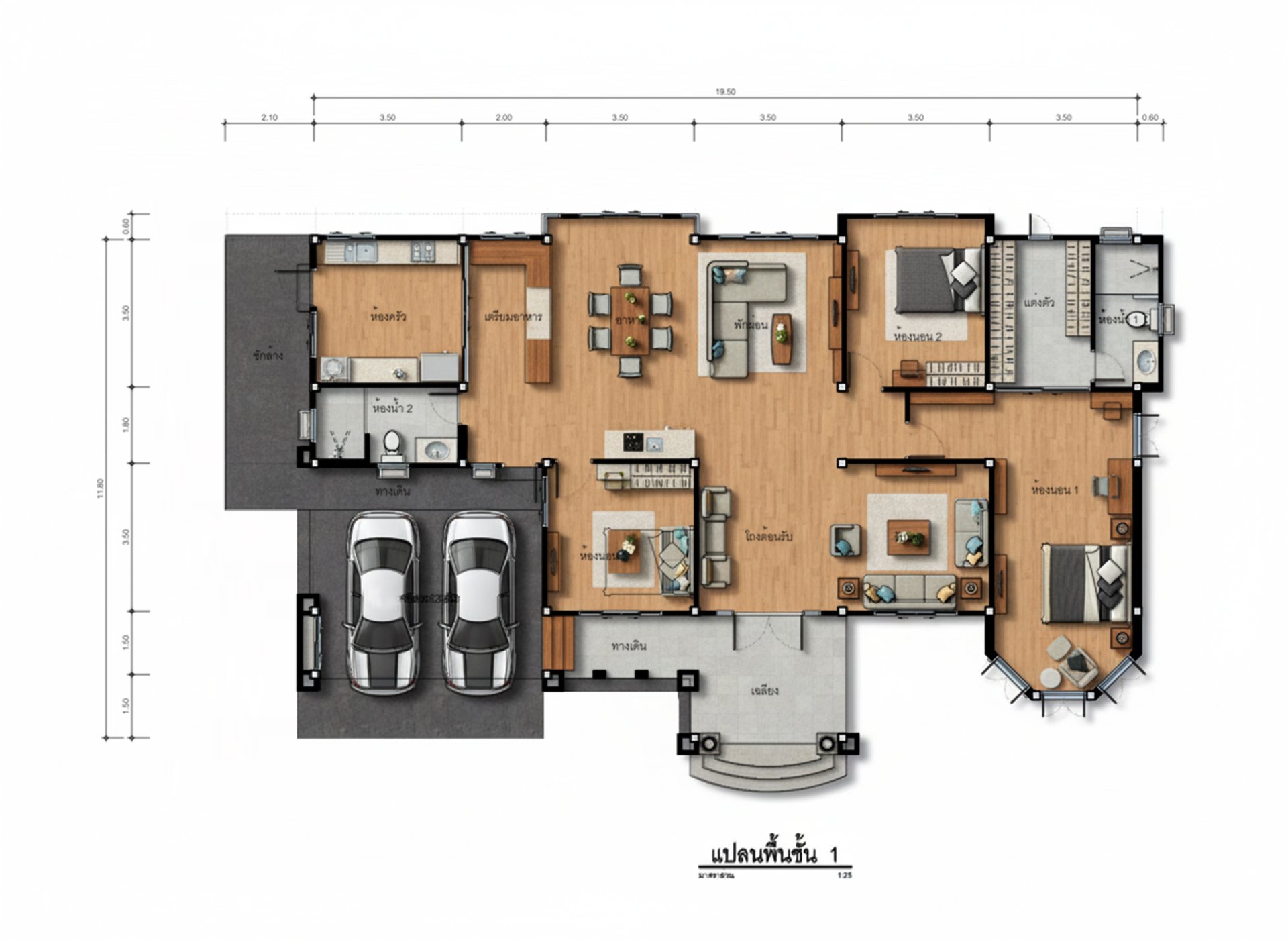 แบบบ้านชั้นเดียว พื้นที่ใช้สอย 230 ตรม. บ้านสไตล์คอนเทมโพรารี่ ฟังก์ชันครบครั่น 3 ห้องนอน 2 ห้องน้ำ รับแขก ทานอาหาร ครัว จอดรถ 2 คัน