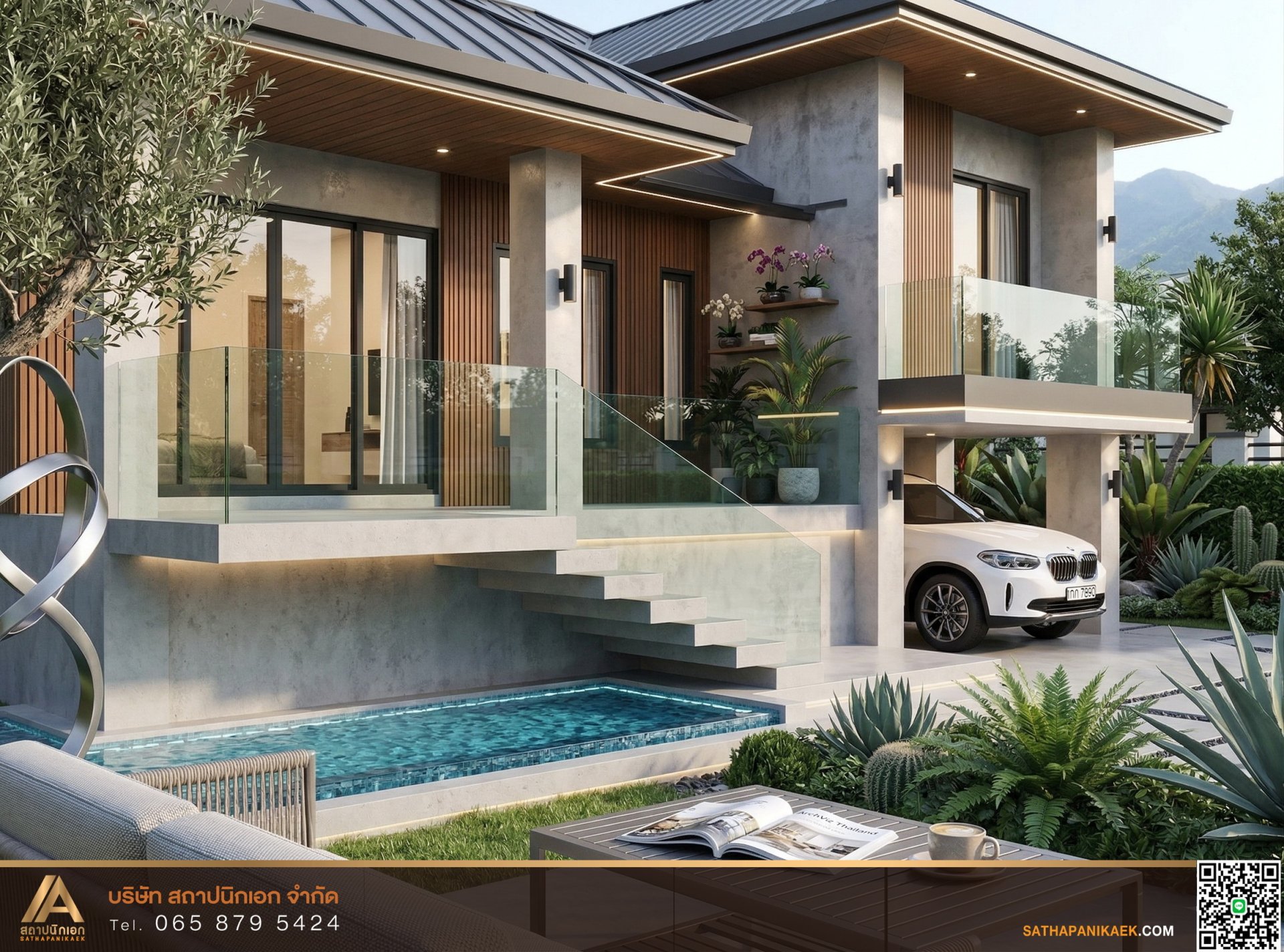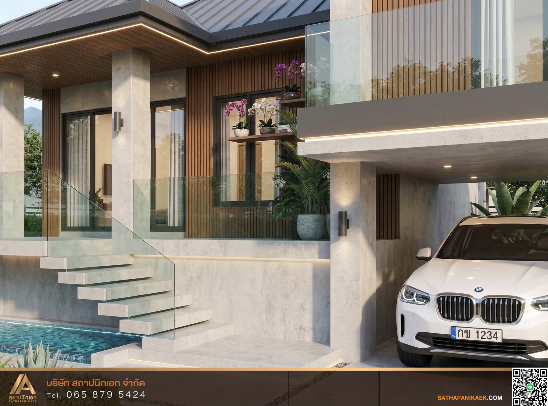 แบบบ้านเล่นระดับหรูหราสไตล์โมเดิร์นมินิมอล (Modern Minimalist) กลิ่นอายมินิมอลที่เน้นความโล่งและบรรยากาศธรรมชาติ ดึงแสงธรรมชาติเข้ามาสู่ตัวบ้านพร้อมระเบียงที่มอบบรรยากาศสไตล์รีสอร์ทให้ผู้พักอาศัยในทุกๆ วัน